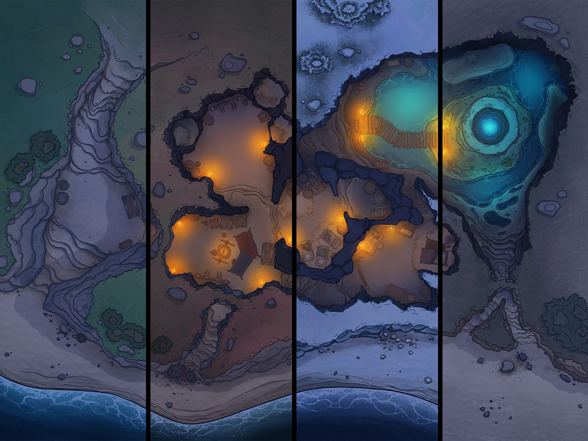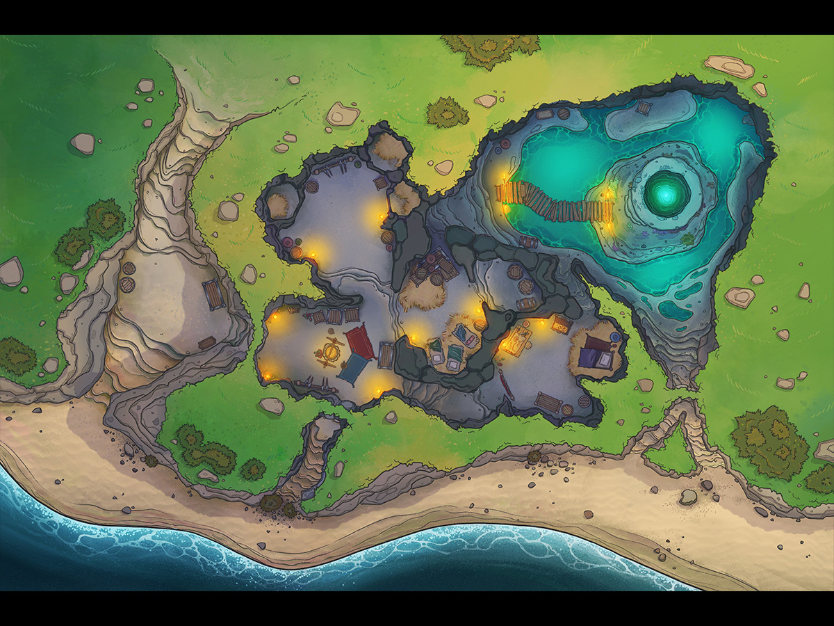 This hand-drawn battlemap depicts a secretive smuggler’s hideout carved into the coastal cliffs, complete with supply rooms, prisoners' cells and living quarters for a band of pirates or cutthroats. But at its edge lies a mysterious grotto, its waters glowing with an eerie light from a sunken well or altar below. Are your players here to raid the smugglers, strike a deal, or uncover what ancient force these criminals have been worshipping? Perfect for a tense infiltration, a nighttime ambush, or a ritual-interrupting showdown.